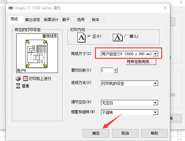 d. 將用紙尺寸修改為之前設置的【用戶自定義5】,然後點擊確定,直接到退出修正。