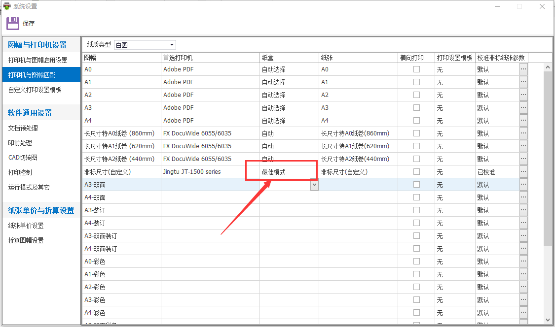 e. 修改打印機紙盒參數為【最佳模式】,保存設置。