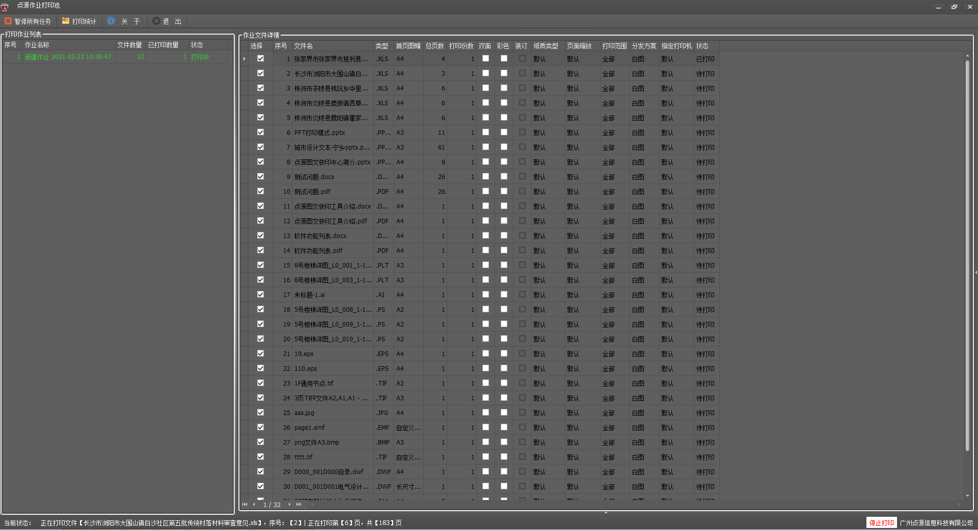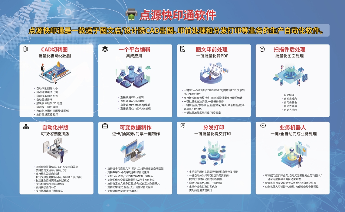 點源快印通軟件(標準版)是專門為圖文快印店/設計院定製的一款生產批量化自動化軟件產品,該軟件包括CAD切轉圖、印前處理、分發打印等主要功能,運用創新模式-業務工作流程自定義業務機器人來實現企業自動化生產。