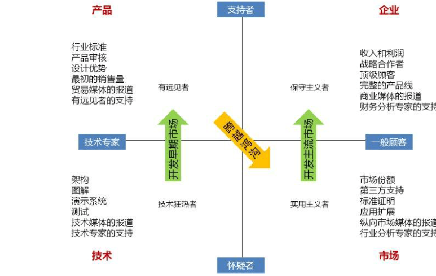 但是在主流市場中,實用主義者和保守主義者主宰者市場中所有的購買決策,核心的價值也由技術和產品變為市場和企業。