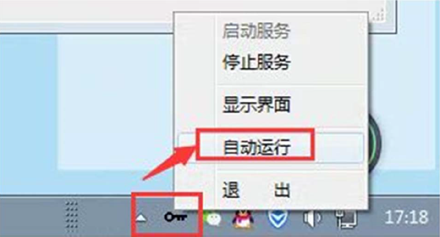 2、即右下角托盤處已啟動服務器,右擊服務器圖標選擇自動運行,啟動自動運行,每當電腦開機就會自動啟動服務器服務。見圖2