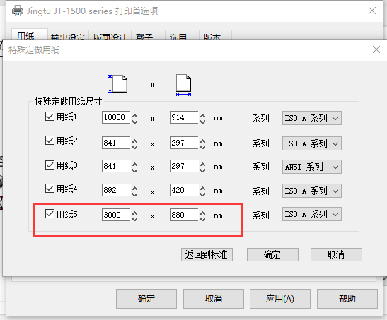 啟用並設置【自定義尺寸5】:(注:此自定義尺寸由點源快印通使用,其尺寸為可能打印圖紙的最大長寬)