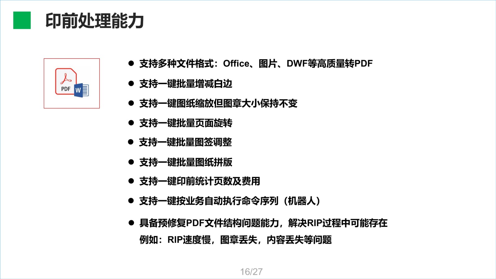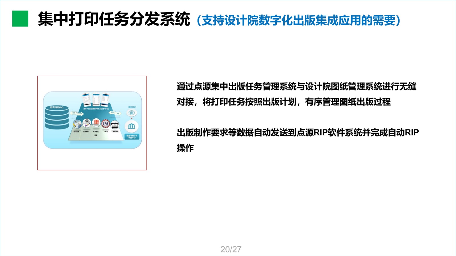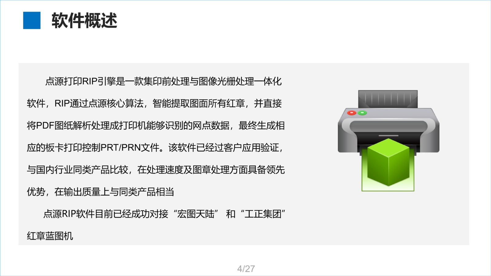 點源RIP軟件是一款集印前處理與圖像光柵處理一體化軟件,RIP通過點源核心算法,能智能提取圖麵所有紅章,並直接將PDF圖紙解析處理成打印機能夠識別的網點數據,最終生成相應的板卡打印控製PRN文(wen)件(jian)。該(gai)軟(ruan)件(jian)已(yi)經(jing)過(guo)客(ke)戶(hu)應(ying)用(yong)驗(yan)證(zheng),與(yu)國(guo)內(nei)行(xing)業(ye)同(tong)類(lei)產(chan)品(pin)比(bi)較(jiao),在(zai)處(chu)理(li)速(su)度(du)及(ji)圖(tu)章(zhang)處(chu)理(li)方(fang)麵(mian)具(ju)備(bei)領(ling)先(xian)優(you)勢(shi),在(zai)輸(shu)出(chu)質(zhi)量(liang)上(shang)與(yu)同(tong)類(lei)產(chan)品(pin)相(xiang)當(dang)。